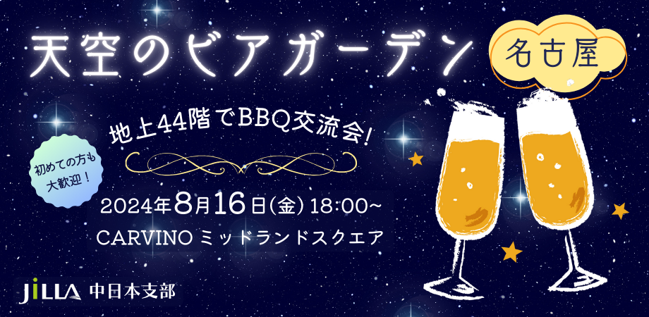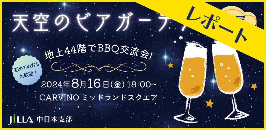 こんにちは、JILLA中日本支部です。 やっと梅雨が明け、夏本番の季節となりました! 中日本支部では8月16日(金)に名古屋のミッドランドスクエアで「天空のビアガーデン・地上44階でBBQ交流会」を開…