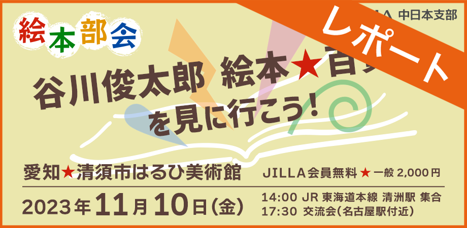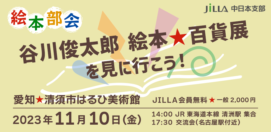 こんにちは。JILLA中日本支部絵本部会の林です。11月10日(金)、「谷川俊太郎 絵本★百貨展」を鑑賞するイベントを行ったので、その様子をレポートします。 平日ということもあってか、参加者は5名(全…