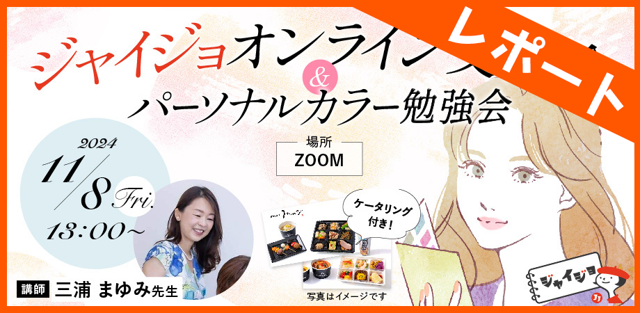 ジャイジョ=ジャイラ女子部のオンラインイベントは、今回で4回目。前半は、カラーコンサルタントの三浦まゆみ先生をお招きし、自分に似合う色「パーソナルカラー」を発見していく勉強会を。後半は、ケータリングで…